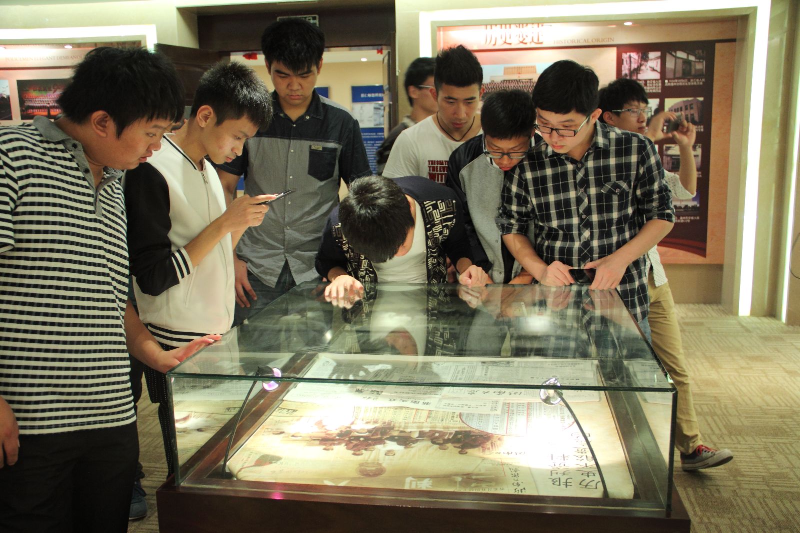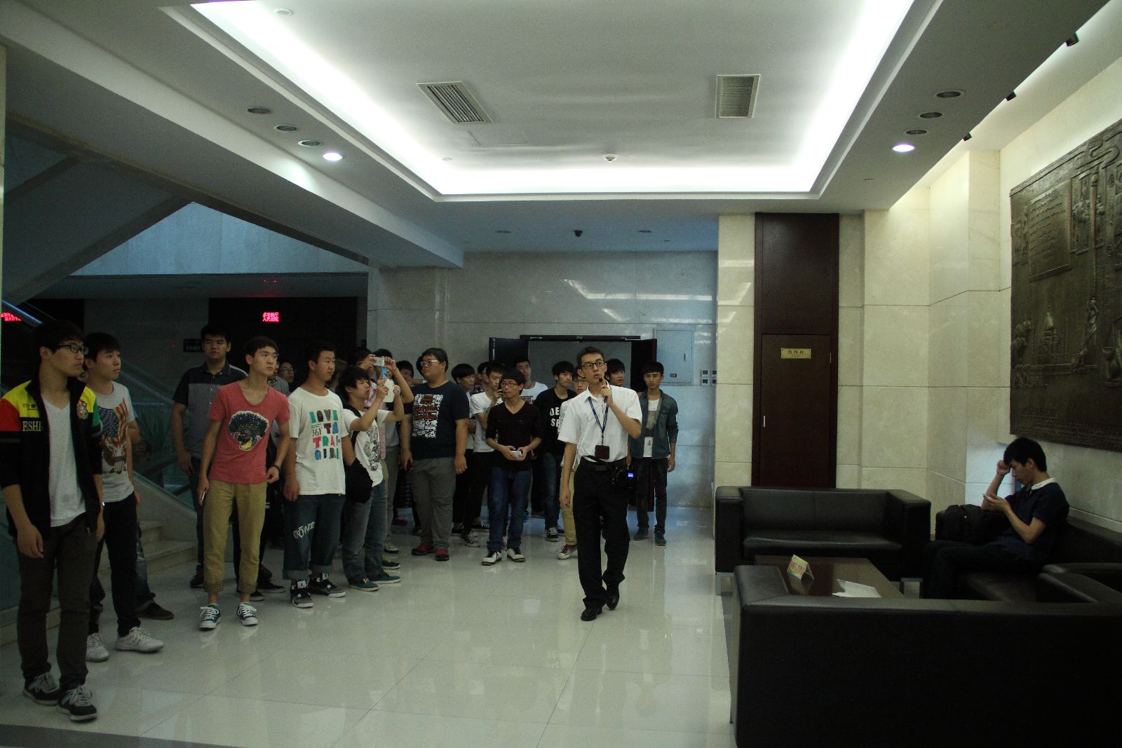 在中院杨法官与讲解法官的带领下,参观组的同学首先参观了中院象征公平与正义的"正义女神" 雕像。接着讲解法官带领参观组同学参观法院文化长廊,体会温州中院"公正、廉 洁、高效、为民"的法律文化。穿过长廊,同学们走进了中院"院史陈列室"。院史室内墙上栏目与实物展览展现了温州中级人民法院的历史变迁、重大案件、荣誉奖章、法制活动以及成员风采,从另一个角度见证了自1949年至今中国法律与法治建设的发展之路。同学们转到了中院正大门,一楼"法治天下"的巨幅浮雕、分列在浮雕两侧的"独角兽"与"和谐"雕像,二楼以中国法治发展与中外不同法系为内容的大型浮雕生动地体现了法律不仅是对公平正义的追求,同时也反映了法律的社会与生活景愿。最让参观组同学兴奋的是中院大法庭审判法庭,同学们在审判长、审判员、人民陪审员等席位争相合影留忆。随后参观组的同学在五楼观看了法制宣传片,之后参观活动结束。