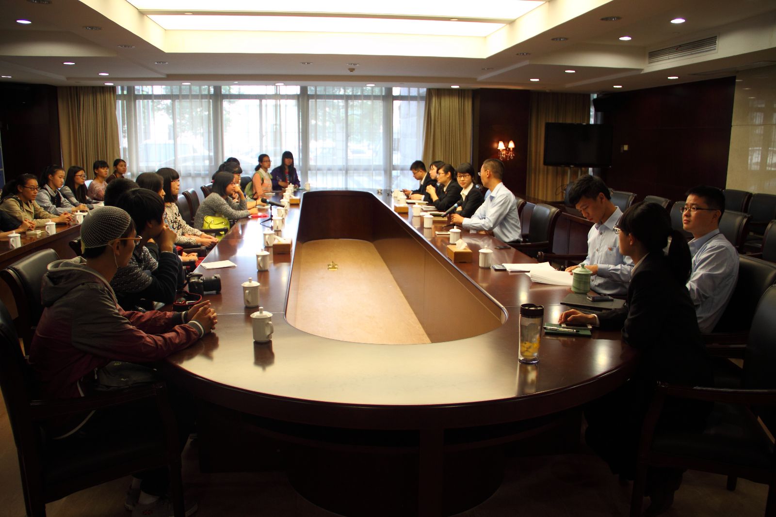 参加座谈会的同学同样受到温州市中级人民法院热情接待。多位同学就"中院实习"、"法科学习方法"、"法律职业"与"就业规划"等多方面踊跃提问,多位青年法官和资深法官耐心解答了同学们的各种问题,并以法学前辈的身份勉励同学们努力学习。座谈会气氛融洽,同学们深感受益匪浅。下午五点左右,全体同学乘车返校,整个参观活动圆满结束。