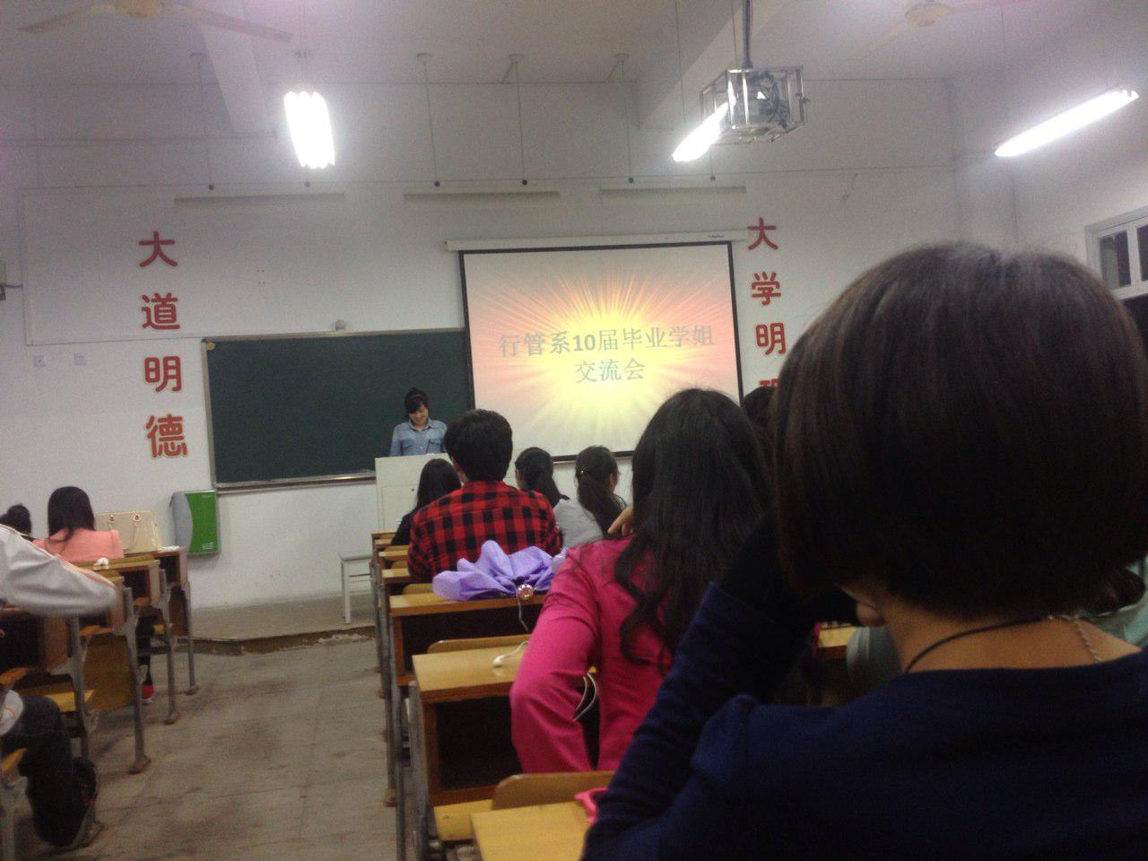 2014年5月12日,10行管的几位学姐应行管老师邀请,来到法政楼103与学弟学妹们进行经验交流。此次活动一共请到了五位优秀的行管毕业学姐,陈影、陈明倩、邢远阁、李弯弯、翟梦洁学姐。
