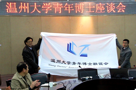 在座谈开始之前,钭晓东会长还现场发布了青年博士联谊会的LOGO设计方案,对联谊会LOGO的设计理念和丰富寓意进行了深入解读,随后蔡袁强校长代表学校向博士联谊会授会旗。