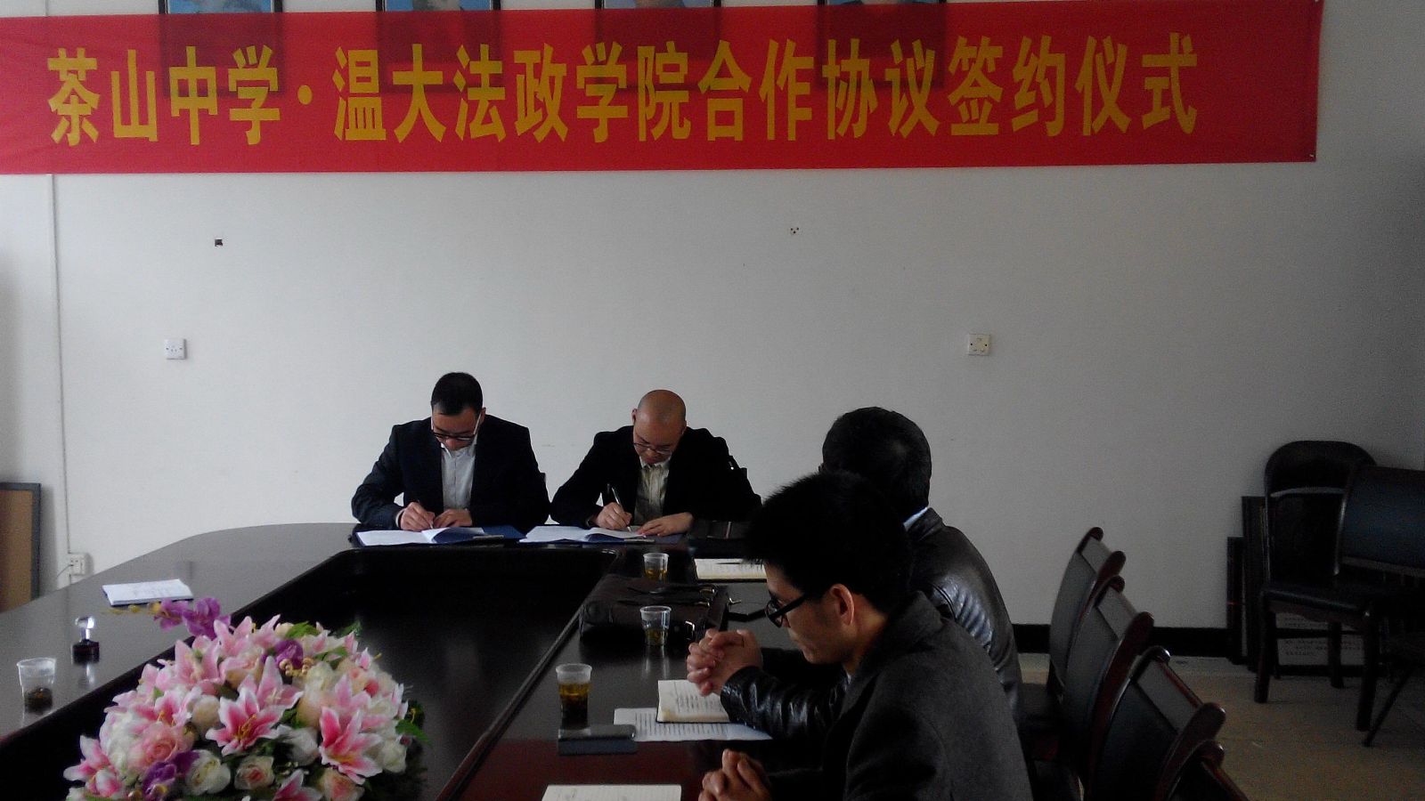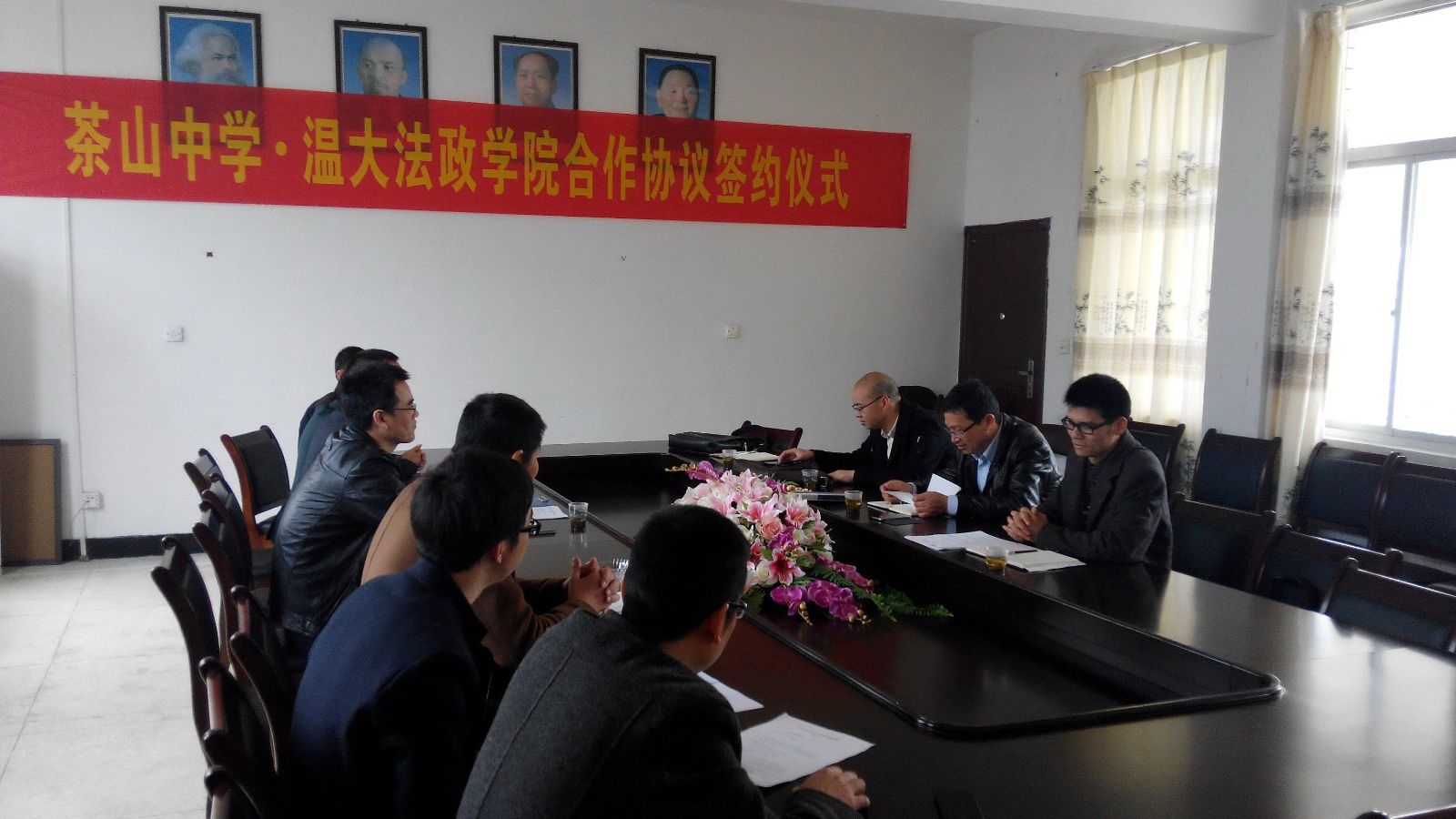 为充分发挥看片狂人 法政学院和茶山中学在学生教育培养方面的互补优势,稳定双方合作关系,进一步提高学生教育培养质量,同时大力发挥学校服务地方发展的作用,2月28日下午,看片狂人 王柏民书记、王宗正副院长、思政系主任吴志敏和思政系实践教学指导老师李斌等一行来到茶山中学开展交流,并就双方的学生培养教育等工作与茶山中学签署了一份系列合作协议。茶山中学黄校长、王校长、叶校长及教务、政教、总务、教科研等部门负责人出席了签约仪式。
