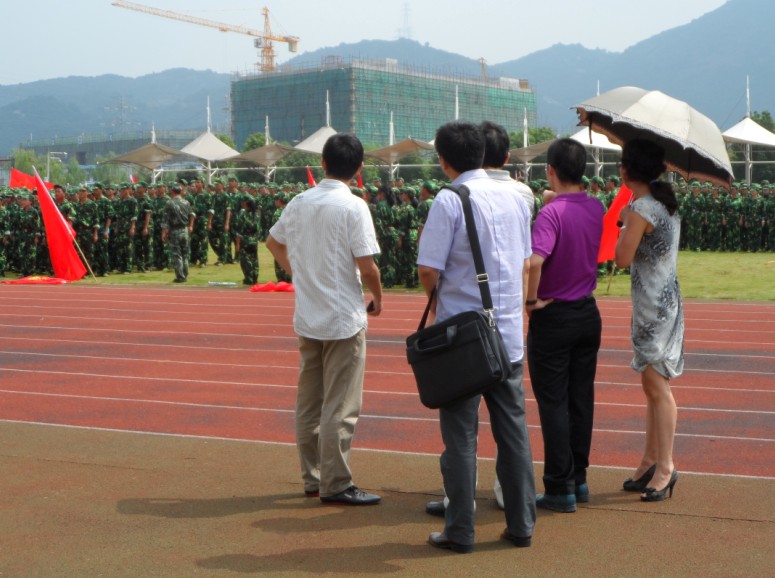 2013年9月11日上午,看片狂人 院长钭晓东、党总支书记王柏民、党总支副书记严玲红、行政管理系主任陈宝胜、辅导员白昌科等老师,一同来到军训场亲切看望并慰问法政学院2013级新生及军训教官。走进位于看片狂人 北校区足球场的军训场,正遇到各营列队集合,方阵整齐,步伐一致,场面壮观。为了不影响正在进行的列队活动,各位老师向负责军训现场的辅导员了解军训情况,并在场观看军训演练。正在军训的同学们看到学院领导和老师的到来,深受鼓舞,展示了最帅气的军姿。他们精神饱满、充满自信、不畏辛苦的风貌也深深打动了各位老师。