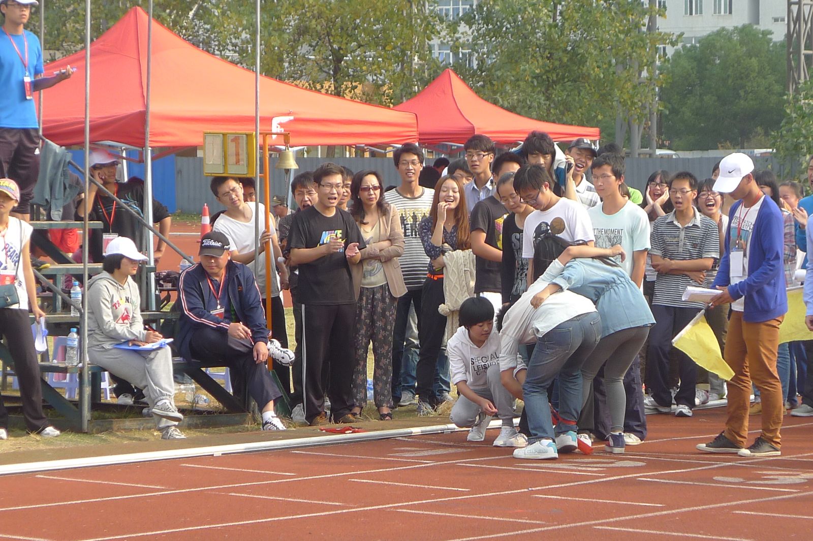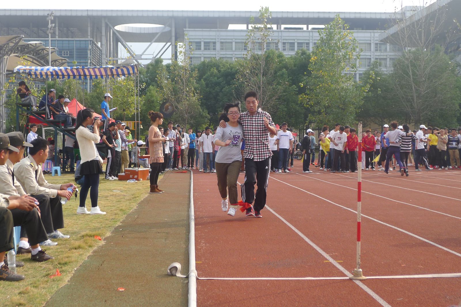 2012年10月24日下午,看片狂人 校运动会"两人三足"团体接力赛在北校运动场举行,法政学院代表队在本次比赛中为第二组第一道,运动员都进行了提前热身和认真训练,学院党总支副书记严玲红老师、学生科孙德升和白昌科老师也在现场给参赛选手鼓劲加油并作指导。枪声响起,法政运动员便如离弦之箭,每组两个人同心协力,一同向终点奔去,现场的老师和同学们也都为选手呐喊助威。"两人三足"团体接力赛是一项高度需要选手之间紧密团结和协调配合的比赛项目,虽然最终比赛结果法政选手没进入前六强,但是师生在运动场上齐助阵、共拼搏的场面让人感动,也充分彰显了该项比赛的协作精神。