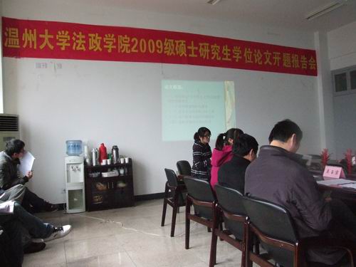 2011年3月5日,法政学院2009级马克思主义基本原理专业硕士研究生在经历了半年多文献阅读、选题确定、资料搜集等毕业论文相关前期准备之后,以开题报告会的形式向相关领域专家汇报已有成果并征询深入研究的建议。上午8时30分,开题报告会在法政楼309教室举行。开题报告会由硕士点负责人李炳安教授主持,评议组组长由特邀专家温州医学院社科部主任杨华教授担任。校党委副书记牟德刚教授、研究生部部长陈安金教授、副院长姚周辉教授以及吴玉宗教授、李业杰教授、王尚银教授、陈国治教授,2010级硕士研究生参加了本次报告会。报告上,研究生逐一将选题的目的、意义、研究现状、研究思路与方法、论文框架、创新与不足之处等方面向各位评议组专家作了全面的陈述;评议组成员则一一就报告内容的各个方面做出了详尽而深入的点评,既尖锐地指出了问题,也中肯地提出了建议,使参加开题的硕士研究生备受启发,使其对今后的研究方向及研究重点更加明确。同时,报告会也促发了低年级同学对钻学问、做研究的深层次思考。