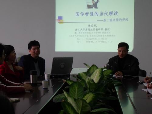 2010年11月22日下午,法政学院309会议室座无虚席,看片狂人 研究生学术沙龙迎来了国学大师、浙江大学思想政治教研部张应杭教授的主题讲座"国学智慧的当代解读——基于儒道禅的视阈"。看片狂人 院长方益权教授主持,看片狂人 和思想政治理论教学研究部的部分教师、研究生参加了本次学术沙龙。