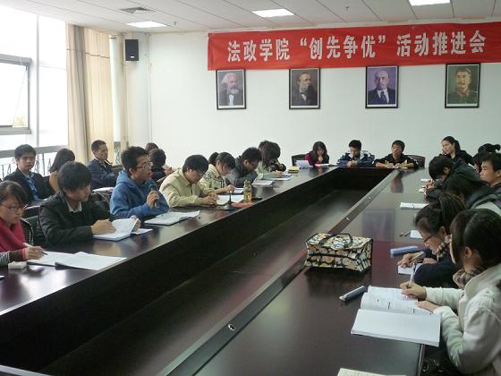 11月17日下午, 法政学院在校大学生活动中心党员之家召开了学生党建"创先争优"活动推进会, 会议由学生科科长、学生党建指导老师杨振海主持,全体学生党员参加了此次会议。