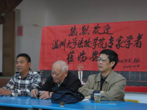 上午,在崇善重孝遗风浓重、有着19年连续评选"孝顺子孙"历史的街头村,法政学院师生一行受到珊溪镇领导、街头村两委和老年协会的热情接待。在街头村老年协会活动室,村镇领导、老协负责人与来访师生开展了有关孝文化的座谈会。座谈会上,街头村孝文化建设负责人介绍了街头村的孝道文化渊源,开展"孝顺子孙"等评选活动的相关组织制度建设,开展孝文化建设以来取得的效果以及街头村孝文化的传播和影响;接着,姚周辉教授发表了自己对孝道文化传承与建设的几点看法,随后研究生同学针对孝文化对新农村建设、和谐社会构建的重要意义以及街头村孝文化的再建设与再传播等问题与村镇、老协领导展开了互动与交流;继而,法政师生参观了街头村孝文化展览馆。