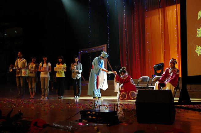 | 在盛夏的阳光下,到处绽开着毕业生的玫瑰花。道声再见,莫忘师生情。美丽的校园,留下了他们青春的足迹和风采。转眼间,"我们毕业了",短短的五个字包含了太多,是不舍,是留恋,是温馨,更是一个新的起点。 追忆青春年华如水 相约灿烂前程似锦 "韬奋钟声,音尤在耳,纵然天涯海角,散各一方,都将万里相伴,让我们再回首,在最初的起点,为最灿烂的青春画上最华丽的句点……"5月23日晚,法政学院全院师生在大学生活动中心演艺厅与06届毕业生齐聚一堂,用一幕幕精彩而饱含感情的节目来回忆四年的生活共话师生情谊。毕业生晚会沉浸着离别的伤感,也弥散着祝福的温馨,每个毕业生淡淡的离愁别绪感染了在场的每一个人。 燃起绚丽缤纷的烟花 回首拔节成长的青春 晚会伊始,学院十佳歌手带来歌曲串烧,无限震撼的开场令场下观众掌声雷动,激情澎湃。此时烟花四起,副院长钭晓东老师走上台,清唱了一首《别亦难》,表达了对毕业生的祝福与不舍,使晚会持续升温。08政本的舞台剧《梁祝》更是将晚会推向了高潮,幽默的台词,夸张的表演,却满载着他们对学姐学长的情谊,希望他们走出大学校园之后都能找到彼此的幸福。之后的游戏"我们的心中的秘密",更是让每个人动容,那些小纸条里承载的不仅仅是青葱岁月的痕迹,更是每个毕业生心中最珍贵的青春。无论是爱的表白,还是冰释前嫌,在这一刻,除了感动,只有珍惜。 相逢是激动人心的歌 离别是催人泪下的诗 《有没有那么一首歌,会让我想起你》,617寝室的全体男生在台上相拥,兄弟之间的那份情谊是那么炙热。方益权院长代表学院为晚会致辞并和学生对歌一首,送上老师对学生的美好祝福。 舞台剧《同桌的你》,是06社本的全体同学在大学的最后一堂课。他们对着班主任集体大喊:"老师,请留步。我们舍不得您,非常非常舍不得您,但是我们必须告诉您,我们必须离开您,我们必须去工作,去谈恋爱,去奋斗,这件事十万火急,我们一天也不能等,请您接受我们离开前最后的问候。"深深地鞠躬,使这位班主任在台上潸然泪下。 用不舍定格离别的镜头 用祝愿抚慰感伤的心情 舞台上缓缓拉开幕布,展示了一些毕业生在校园各处拍照留影的镜头,学子广场的草地,图书馆前的小桥,伴随汗水与友谊的球场,熟悉的课堂,可亲可爱的老师,走过一遍又一遍的小道……这里记录了他们走过的快乐与忧伤,也见证了他们的友谊与爱情。所有这些记忆里的符号都定格成为永恒,贴进青春的记忆册里,作为一生的慰藉。 欢笑与洒脱挥别昨日 责任与勇气承担未来 游戏《非诚勿扰》惊爆全场,三位男孩子用朴实幽默的语言征求12位美女的芳心,他们以一种特殊的方式给四年的大学生活挥手告别。最后,全场以一场激情洋溢的大合唱《明天会更好》表达了对毕业生们深深的眷恋、祝福和同时也是对温大法政美好未来无限的向往。 祝福毕业生,希望他们一路走好,也希望他们牢记"法治天下,政通人和"的理念,并将它带到自己的工作岗位上。