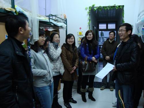 3月10日晚,法政学院学院党政领导、教学科、学生科老师和09级新生班主任一行分组来到学生寝室看望09级新生,了解学生的假期生活和到校后的精神面貌,并就本学期的专业分流工作与同学们进行交流。