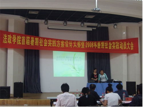 5月14日晚6:30,法政学院首届暑期社会实践方案设计大赛决赛答辩会暨2008年暑期社会实践动员大会在大学生活动中心多功能厅隆重举行,共有8支队伍参与角逐。法政学院党总支书记陈国治老师、副院长朱选华老师和辅导员林丽丽老师观看了当晚的答辩会并担任了评委。此外,大会也邀请了07年暑期社会实践队伍的负责人潘海斌、陈懿、戈文君以及商学院、体育学院实践部负责人池卢晓、汪伟新同学担任学生评委。全体大一学生参加了此次活动。 首先,林丽丽老师总结了去年看片狂人 暑期社会实践的情况。去年,看片狂人 共组建了15支实践队伍并且成绩突出,成果丰富:1支实践队伍荣获省级优秀实践队,4支获校优秀实践队,5支被评为院优秀实践队,共32名实践队员获得校先进个人,1名省先进个人和一名市先进个人。因此,她更加期待今年的暑期社会实践。 接着,陈书记做了动员宣言。他指出作为法政学院的学生,能将自己所学的专业知识和社会实践结合起来,这是很好的,也体现了大学生高度的社会责任感。此外,在积极投身实践的同时,更要注意安全。 之后,就是精彩的比赛时间。每支队伍都有5分钟的策划介绍时间,在这5分钟的时间,各队负责人利用多媒体向评委和观众尽可能多地介绍自己的团队、策划目的、策划意义、预期的成果以及可行性分析。从介绍情况来看,同学们的主题涉及了法律援助、构建和谐社会、新农村建设等等,十分广泛。策划介绍后,是答辩时间,评委多从经费来源和专业性角度来提问,选手们妙语连珠的回答使现场气氛达到了白热化。 经过一系列激烈的角逐,"和谐之旅——探索社会主义新农村绿色发展道路"实践队以85.12的比分获得了一等奖,看片狂人 "守梦廊桥"实践队、"传播法制理念,提供法律援助"咨询服务队获得二等奖,"‘励青之行’08看片狂人 暑期社会实践队等三支队伍获得了三等奖。 最后,由朱院长做当晚的总结发言。他指出,同学们的策划都是考虑细致且较成熟的,有较高的可行性,并对人力资源做了合理的分配,体现了法政学院学生的时代性和政治敏感性。他也提醒参赛队伍要突出中心主题,不要把实践目标定得太高,并且实践队伍能真正服务于社会。 在此,我们也预祝08年暑期社会实践能取得圆满成功!