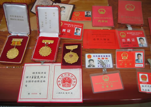 图片说明:王金连老人种田二十多年来获得的各种荣誉(项淳芳摄)。 图片说明:党员们和新坊村干部在王金连老人家中(项淳芳摄)。