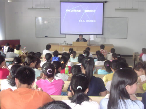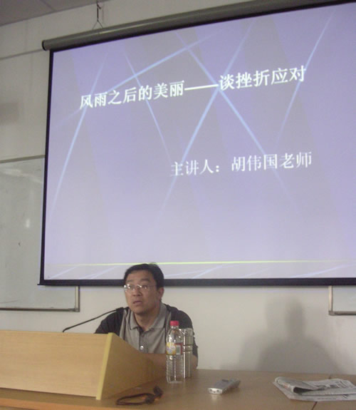 6月8日下午,看片狂人 心理咨询会的两位老师在2幢202教室给我们法政学院的学生做了两场别开生面的心理讲座。一场是胡伟国老师的《风雨之后的美丽——谈挫折应对》,另一场是朱浩亮老师的《"爱"的成长——大学生恋爱与心理健康》,两位老师分别从挫折的应对和恋爱这两个角度出发,循循善诱,生动形象地给在场的同学上了两场心理辅导课。 胡伟国老师首先采用互动的方法,要求在场同学在4分钟内写出除夕之夜的5个愿望,接着邀请一位同学每次舍弃一个愿望,从最后剩下的愿望来看他的遇挫能力。这个互动一下子激活了现场气氛,大家的积极性也提高了许多。然后胡老师以发生在学校的事件作为案例,对我们在学习、生活、沟通等方面遇挫时所表现出来的情况进行探讨,从现象入手,深入浅出地告诉我们挫折对我们所起到的积极、消极作用,为什么同样的挫折会产生不同效果的原因和我们遇挫时应持有的态度。最后,胡劳师要求我们"不要在冬天看书",即让我们在心灰意冷、感到前途渺茫时,不要对自己失去信心,记注希望在前头。让我们持着一颗永不放弃的心,记注最美丽的风景总是在风雨后出现的。 与胡老师不同的是,朱老师用诙谐的语言给我们介绍了"爱"的成长——大学生恋爱与心理健康。他从对爱情的科学理解出发,提出当前大学生的恋爱特点及现状,并从中分析出大学生恋爱的常见问题以及恋爱心理和行为的调适。朱老师的招牌式的幽默语言一次次赢得了在座同学们的掌声。在讲座接近尾声时,朱老师让我们记注"三草"名言——"天涯何处无芳草"、"兔子不吃窝边草"、"好马不吃回头草",并要求我们理性地对待大学四年中的恋爱问题。 下午的两场心理知识讲座在大家的欢声笑语中落下帷幕,本次活动开启了同学们的心理大门,让他们感受到了关爱原来从心开始。