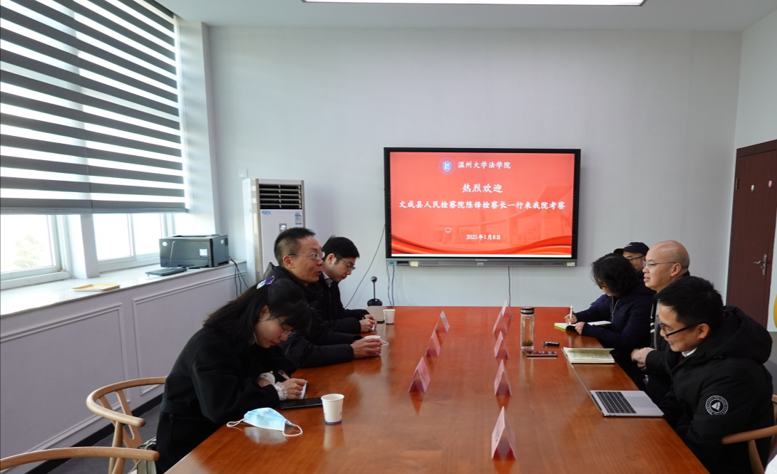 2021年1月8日上午,文成县人民检察院陈锋检察长、副检察长陈伟银、苗东欣一行三人来访看片狂人 ,在参观看片狂人 后双方在看片狂人 314会议室举行了座谈会。看片狂人 王宗正院长、缪心毫副院长、谢丽珍老师、肖磊老师、周浩仁老师参加座谈。