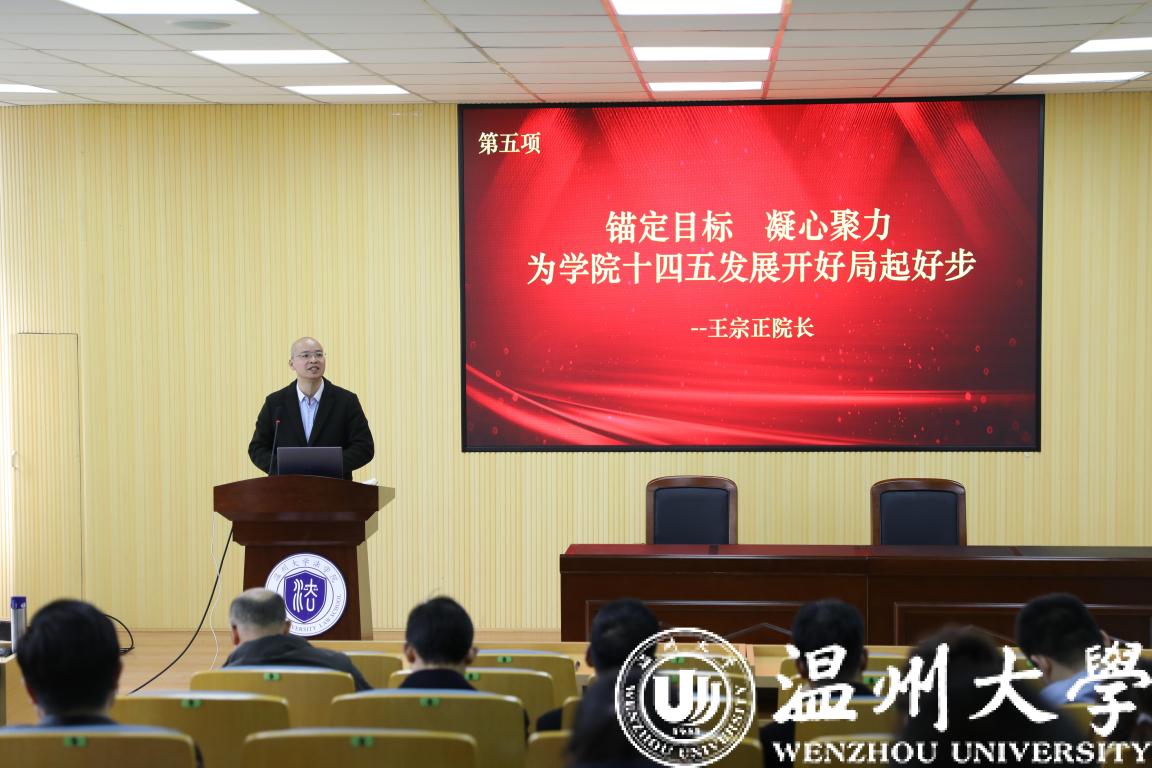 王宗正院长以《锚定目标 凝心聚力 为学院十四五发展开好局起好步》为题,做总结讲话,他结合赵敏校长在新学期全体教工大会上的讲话精神和学院新一年的目标任务,强调了以下几点:一、凝心聚力,增强学院发展的使命感;二、各尽其责,提升学院目标的达成度;三、健全机制,保障学院发展的持续性。