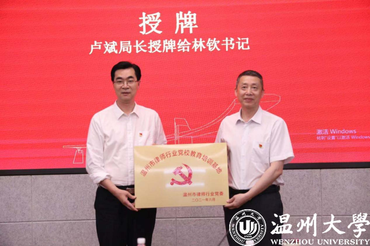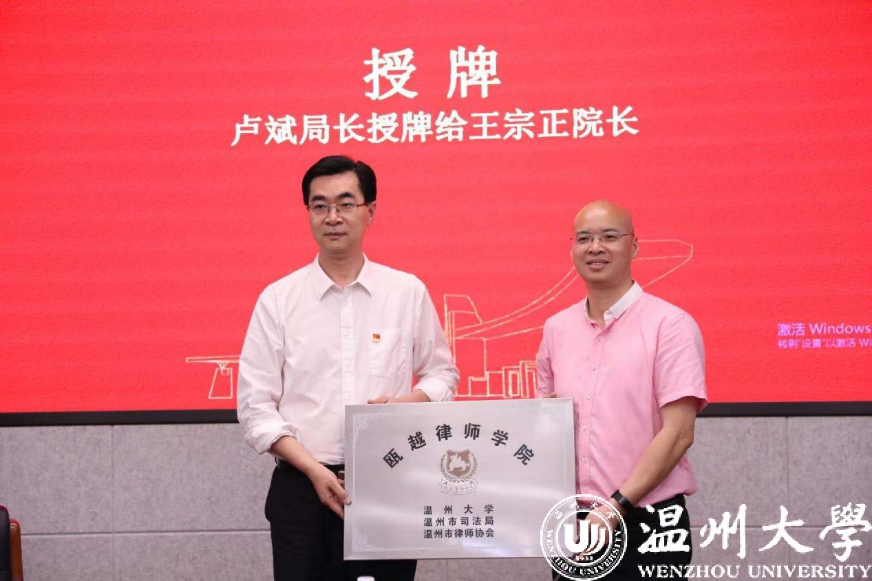 2021年6月1日下午,看片狂人 、温州市司法局、温州市律师协会在看片狂人 南校区岩松堂隆重举行瓯越律师学院协议签约和挂牌仪式。看片狂人 党委副书记吴金法、温州市司法局局长卢斌、温州市律师协会会长叶连友出席仪式并致辞。看片狂人 王宗正院长主持签约仪式。温州市司法局党委委员、副局长林向光、市律协班子成员,温大看片狂人 林钦书记、周湖勇副院长以及相关人员参加本次活动。