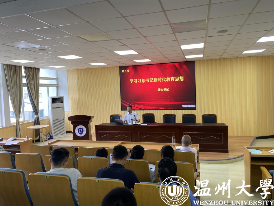 会议议程第五项是由林钦书记做学习习近平总书记新时代教育思想的主题宣讲。林钦书记通过习近平总书记的系列讲话,提醒各位老师要进一步在学懂弄通做实上下功夫,内化于心、外化于行,学做融合养成行动自觉,增强“四个意识”,坚定“四个自信”,做到“两个维护”,弘扬高尚师德,潜心立德树人,以赤诚之心、奉献之心、仁爱之心投身教育事业。