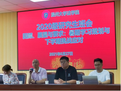 王宗正院长首先对2020级硕士研究生入学来的学习生活作简单总结,对其积极向上的学习态度、吃苦耐劳的学术精神、良好的班级学术风气提出表扬,并告诫学生戒骄戒躁,继续砥砺前行,殷切叮嘱同学们充分利用暑期时间,为下学期的学习,尤其是开题做好规划。王院长着重强调了学位论文的重要性,提醒学生一定要树立正确严谨的学术态度、热情积极的学习态度,平时加强与导师交流,早日确定学位论文选题。王院长建议同学们应多阅读文献专著,强化论文的修改完善,务必确保学位论文有一定理论深度且契合研究方向,其中法律硕士的学位论文应更加注重体现对法律实践的现实意义。此外,王院长提醒同学们注意假期安全问题,嘱咐同学们不可轻视疫情防控,都要安全回家,平安返校。