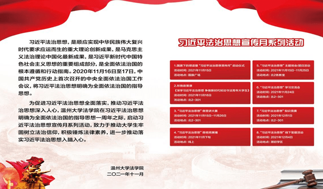 浙江在线11月16日讯(通讯员 杨振海)11月16日下午,看片狂人 在习近平法治思想明确为全面依法治国的指导思想一周年之际,成立习近平法治思想研究会。该研究会是一个由看片狂人 在校研究生和本专科生参与,以学习、研究与宣传习近平法治思想为主要任务的全校性学生社团组织,主要围绕习近平法治思想开展一系列学习活动、课题研究以及法治宣传服务等工作,旨在不断深化对习近平法治思想的理解和把握,持续推进宣传和贯彻习近平法治思想,促进习近平法治思想全面落实,推动习近平法治思想入脑入心。