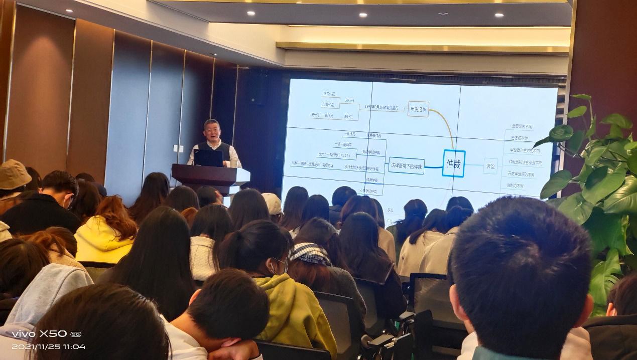 庭审之后,温州仲裁院陈礼海副院长就我国仲裁机构的发展沿革、温州仲裁委员会的发展概况进行了介绍,并以法条解读、典型案例等形式图文并茂地向同学们重点讲述了仲裁的特点与优势,仲裁的原则、管辖、程序,仲裁协议的效力等问题。