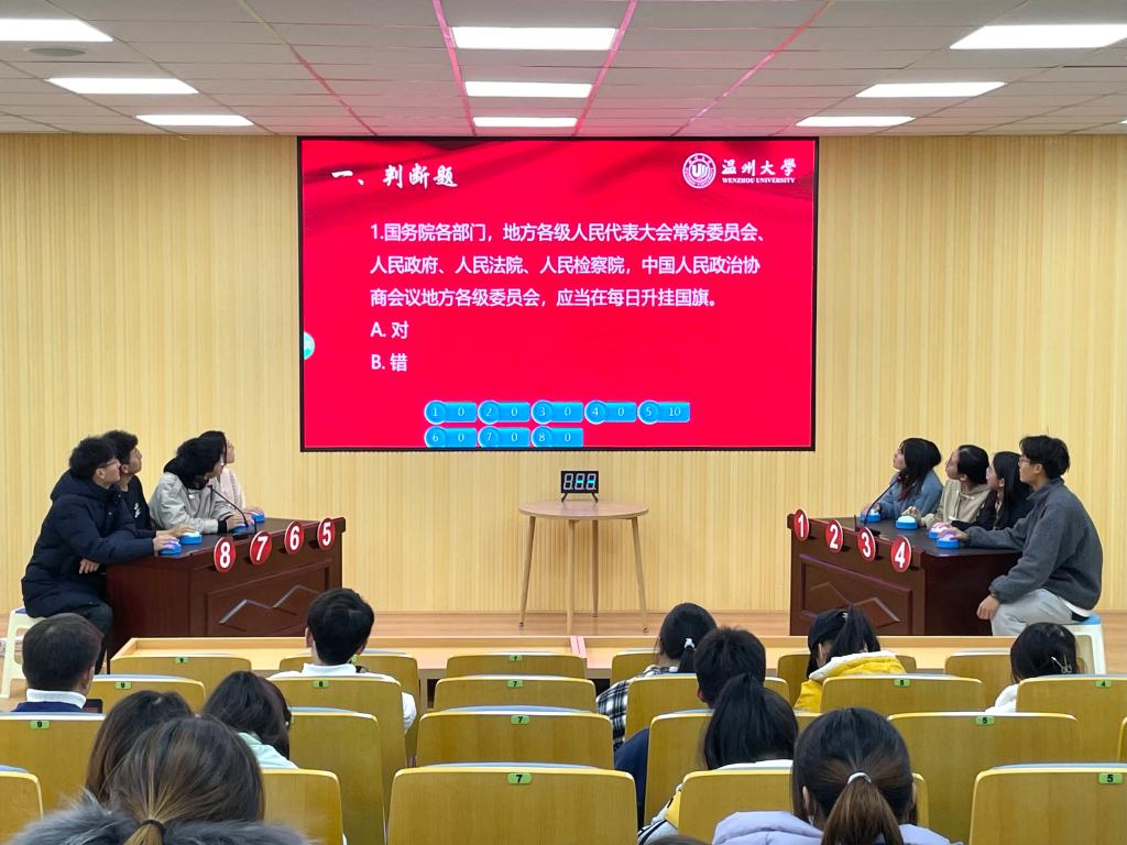 12月1日,“宪法宣传周”系列活动之“习近平法治思想”知识竞赛在看片狂人 北校区举行。知识竞赛重点围绕习近平法治思想相关内容,设有判断题、单选题、多选题和逻辑题。700余名学生参与到了知识竞赛初赛环节,最终选出24名选手进入决赛。决赛现场紧张刺激,答对得分、答错扣分的竞赛机制也为比赛增加了更大的悬念。知识竞赛充分检验了大学生对习近平法治思想、宪法知识的掌握程度,将法治学习的知识性与趣味性融为一体。
