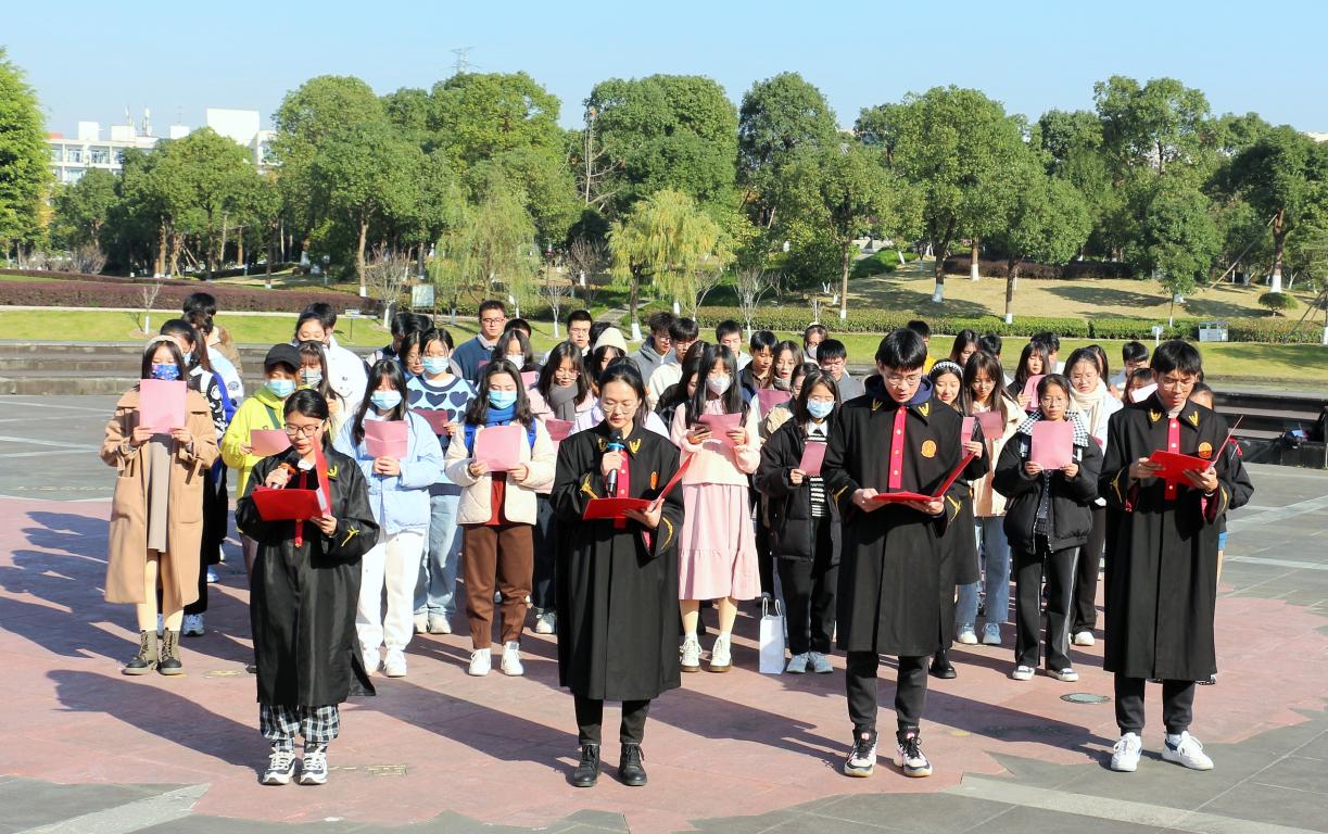 “我宣誓,忠于中华人民共和国宪法,维护宪法权威,履行法定职责,忠于祖国、忠于人民,恪尽职守、廉洁奉公,接受人民监督,为建设富强民主文明和谐美丽的社会主义现代化强国努力奋斗!”……铮铮誓言,掷地有声,同学们全神贯注,高举右拳,作出庄严宣誓,五星红旗扬起,自豪之情融于朗朗誓词中。随后,同学们合唱宪法主题歌曲《宪法伴我们成长》,从歌声中体会宪法温度、感受宪法力量。