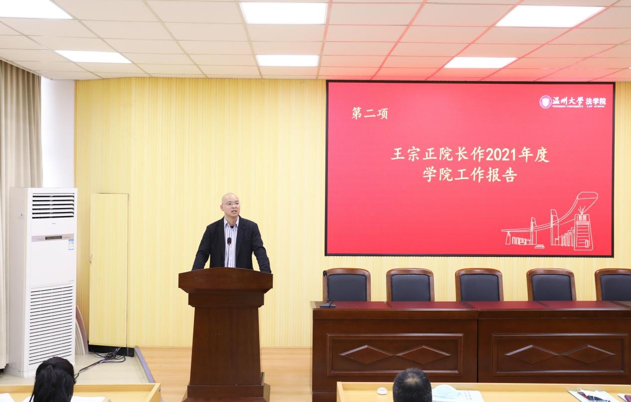 院长王宗正作《看片狂人 2021年度院长工作报告》,报告回顾了2021年学院在本科教学、学科科研、师资建设、地方服务、学生培养、基层党建等方面所取得的成绩。同时从全面提升本科质量、做好学科科研与研究生工作、强化人事工作政策引导、突出服务社会工作重点、提升人才培养质量显示度、党建引领学院和谐发展六个方面对2022年学院工作进行了展望,鼓励全体教师要着力推动学院持续快速发展。