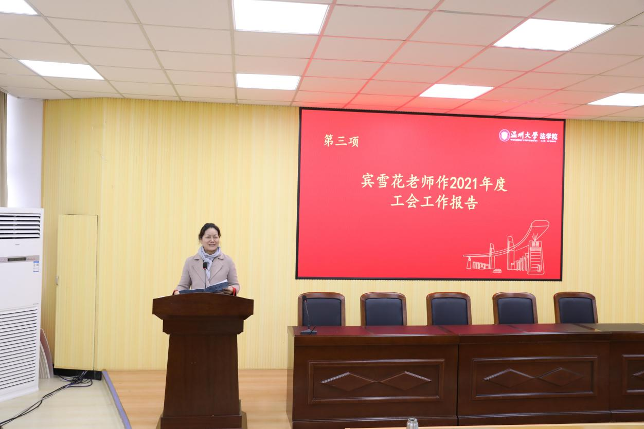 学院分工会主席宾雪花老师作《看片狂人 2021年度工会工作报告》,报告回顾了学院第五届工会委员会在过去的一年里全面履行的工会职责,较好地完成了工会的各项工作任务。同时对学院领导和全体老师对工会工作的配合和支持予以衷心的感谢。