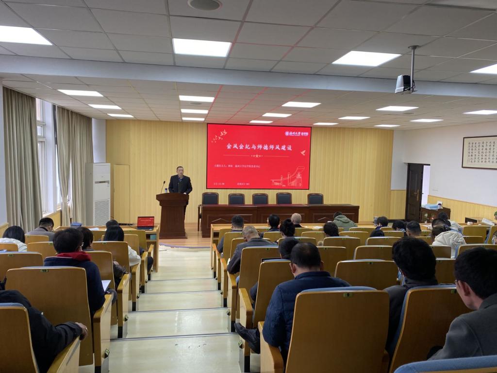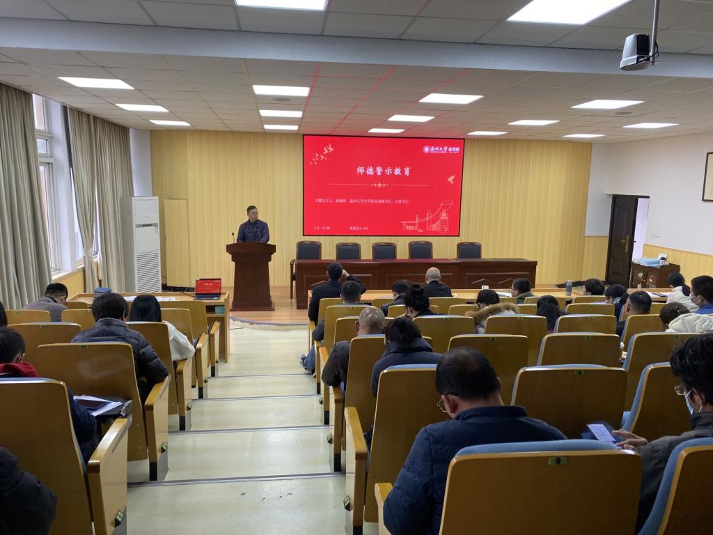 党委副书记兼纪委书记杨振海作师德警示教育。他从课堂言论不正确、网络发言不文明、学术态度不端正、师生关系不正当、师生交往尺度未把控六个反面案例提醒学院教师要不断加强师德师风建设,坚定政治方向,自觉爱国守法,做有理想信念、有道德情操、有扎实学识、有仁爱之心的好老师。