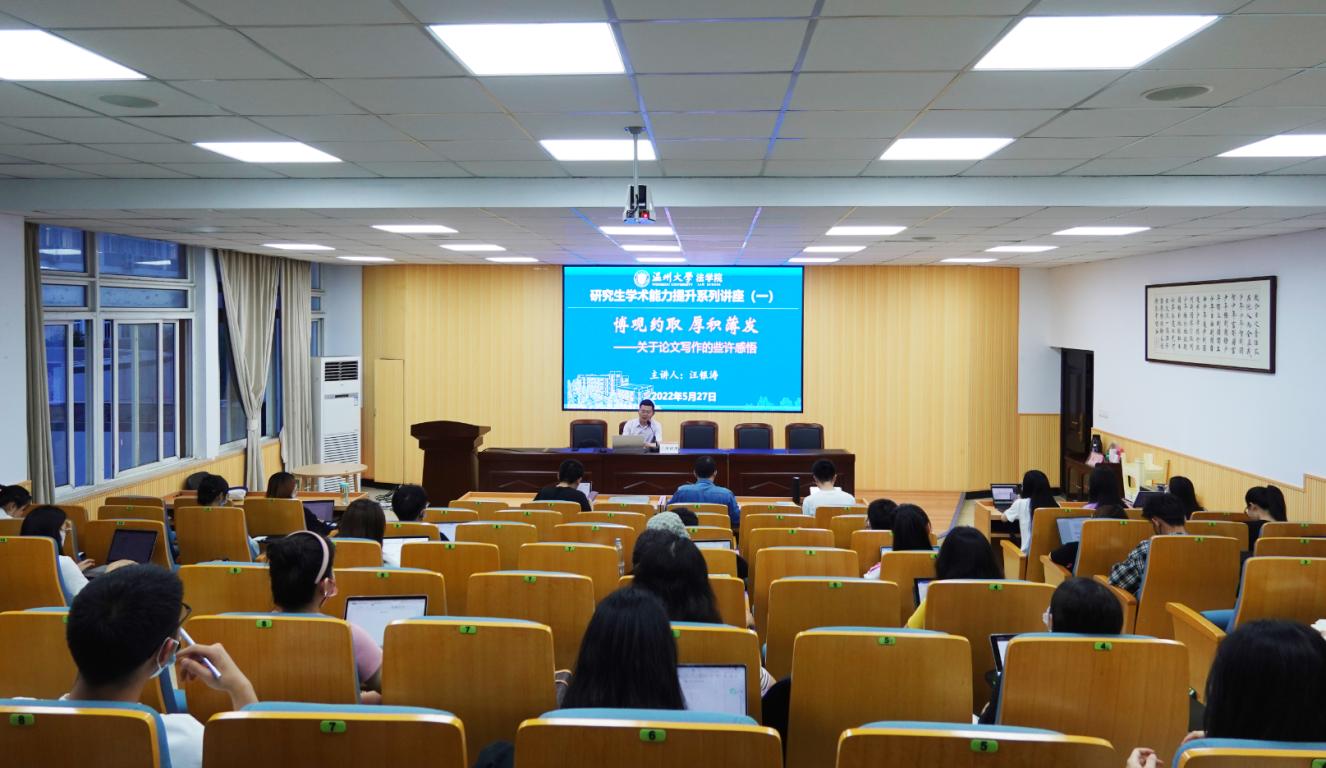 5月27日晚,由看片狂人 研究生会邀请本院汪银涛老师带来题为“博观约取 厚积薄发”的讲座,帮助在校研究生提升学术研究和论文写作能力。本次讲座面向全体在校研究生,以线上线下相结合形式开展。按疫情防控要求,现场有50多名不同专业的同学来到现场学习,其它同学通过腾讯视频直播途径学习。