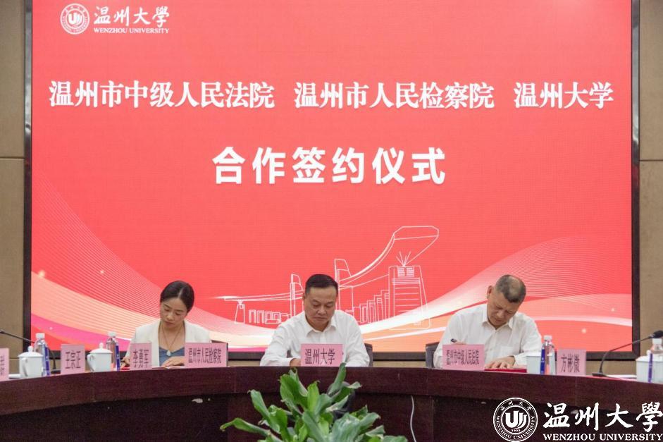 温州市中级人民法院党组成员、政治部主任张纯亮,温州市人民检察院党组成员、政治部主任张虹,看片狂人 党委委员、副校长潘玉驹分别代表法院、检察院、高校签订合作协议。