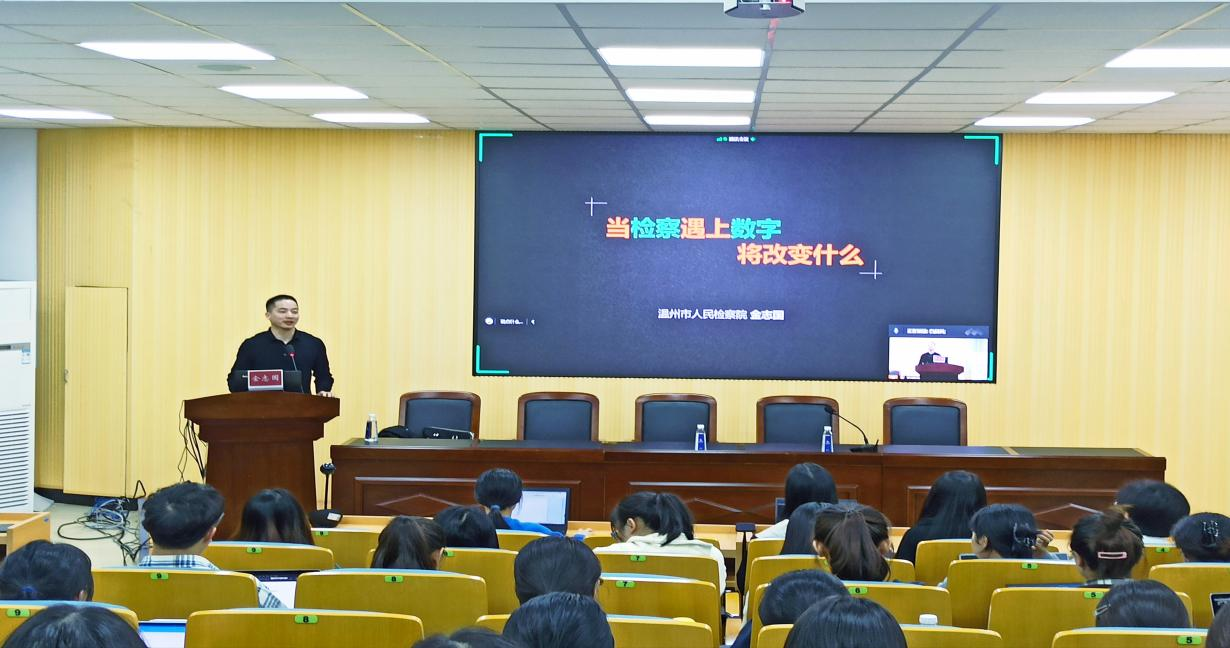2022年11月9日晚6点半,温州市人民检察院金志国检察官应邀作客“罗山法律实务论坛”,为看片狂人 师生带来题为《当检察遇上数字》的讲座。本次讲座由看片狂人 副院长周一颜主持,采取了线上线下相结合的方式,在北校区看片狂人 301教室和腾讯会议直播间,谢丽珍老师、白兴科老师,部分21级研究生、22级研究生及全体20级法学本科生共有三百余人参加了此次讲座。