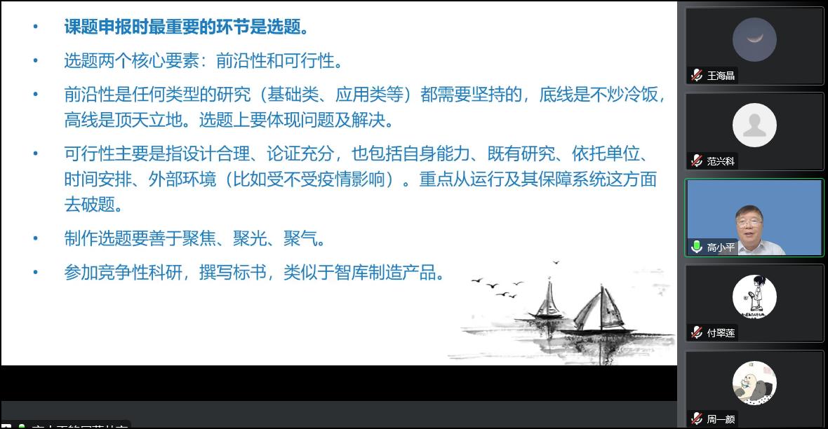 为做好2023年国家社科基金前期准备工作,进一步提升重大项目申报能力,近日看片狂人 邀请国家社科基金学科评审组成员高小平老师做了题为《社会科学基金项目申报的几点思考》专题讲座。讲座由看片狂人 副院长周一颜老师主持,学院拟申报2023年度国社科基金项目的二十余名教师参加了此次线上辅导交流。