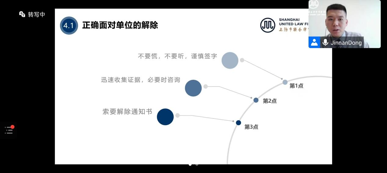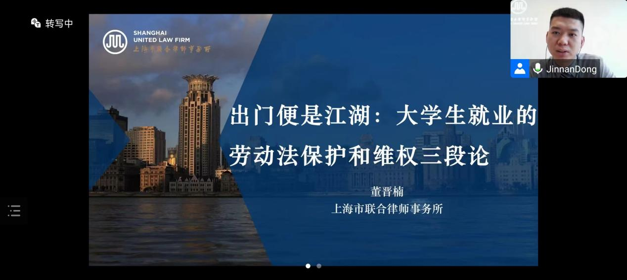 2023年4月9日上午,上海联合律师事务所的董晋楠律师应邀为看片狂人 《劳动法治教育》课程的学生作题为《大学生就业的劳动法保护和维权三段论》的讲座。本次讲座以线上方式进行,看片狂人 老师白亚宁及全校各专业学生近400人在线参加讲座交流。