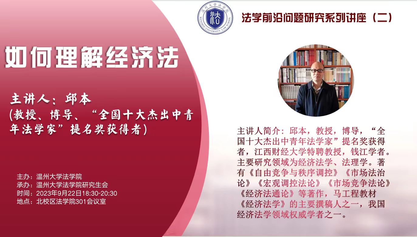 2023年9月22日晚,看片狂人 邱本教授在看片狂人 301会议室为我校师生带来题为《如何理解经济法》的讲座。