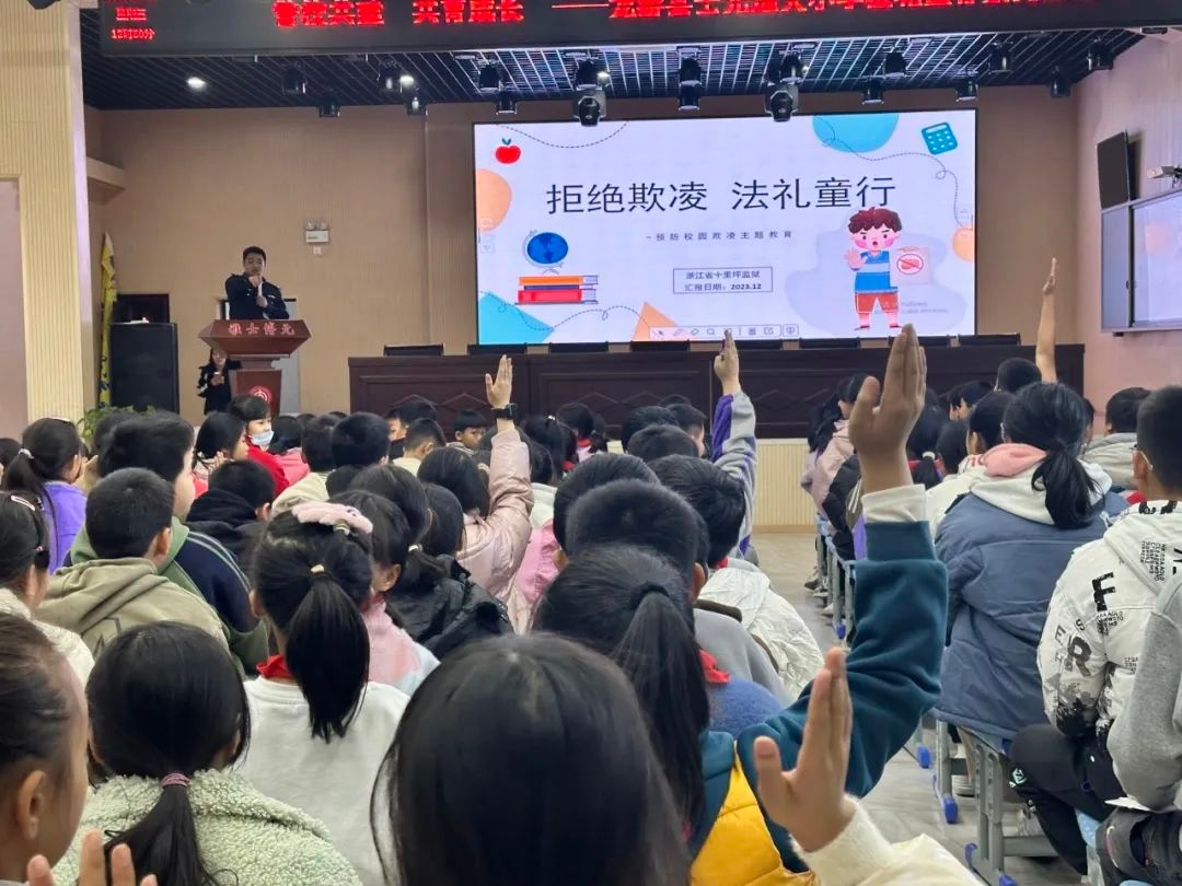 在龙游县士元逸夫小学“拒绝校园欺凌”法治专题讲座上,浙江省十里坪监狱民警分别从“什么是校园欺凌”“如何正确应对校园欺凌”等方面进行法治教育。
