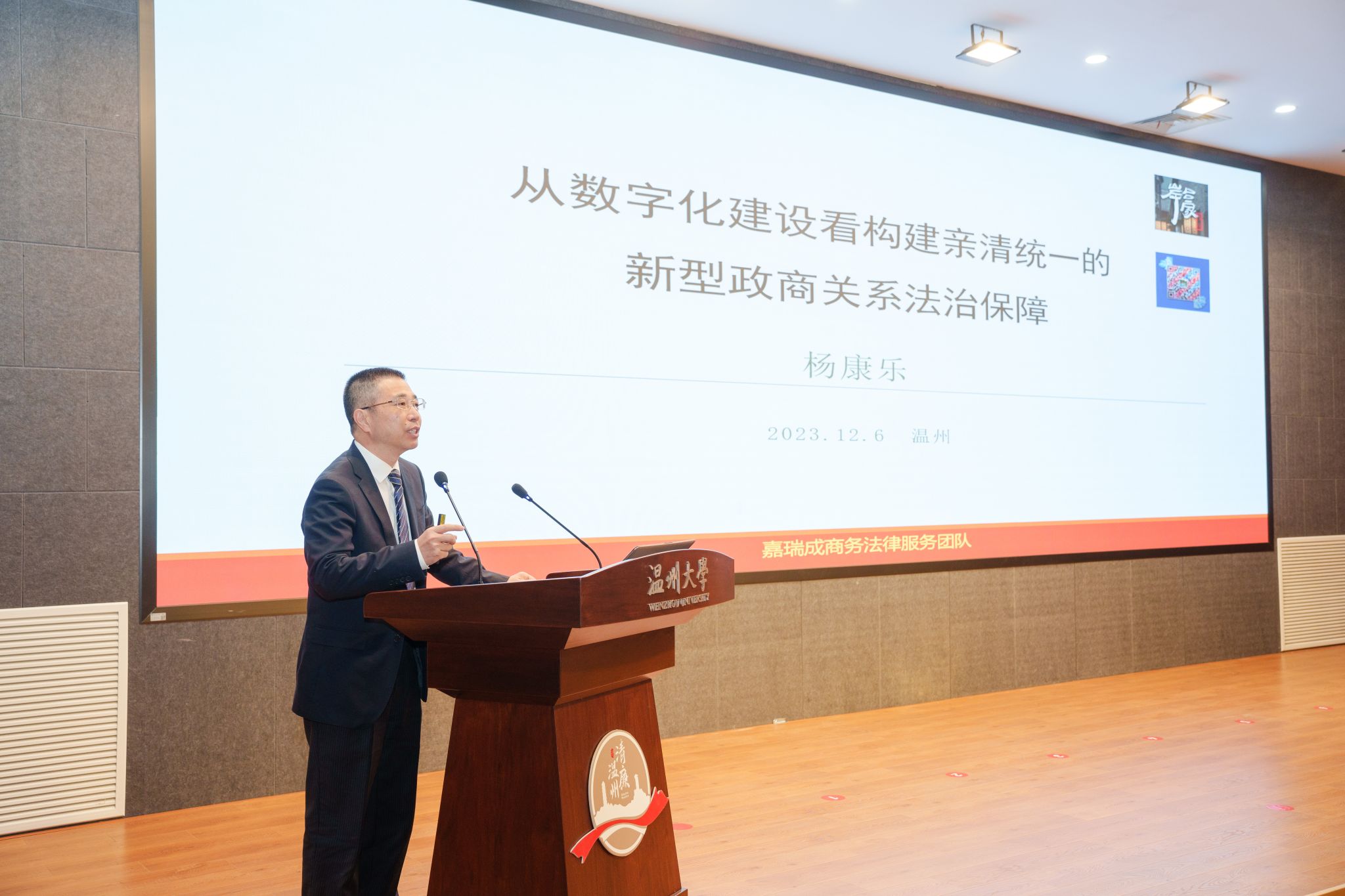 浙江嘉瑞成律师事务所首席合伙人杨康乐作题为《从数字化建设看构建亲清统一的新型政商关系法治保障》报告。他结合具体的法律案例分析了在亲清政商关系构建过程中出现的数字化问题。他强调,法治建设是数字化的底层逻辑,建议数字化与法治建设应当有机融合。结合法律实务,杨康乐从向前端延伸、在后端监督、以数字化为手段、法治化为基准等方面为构建亲清政商关系提供了方向。