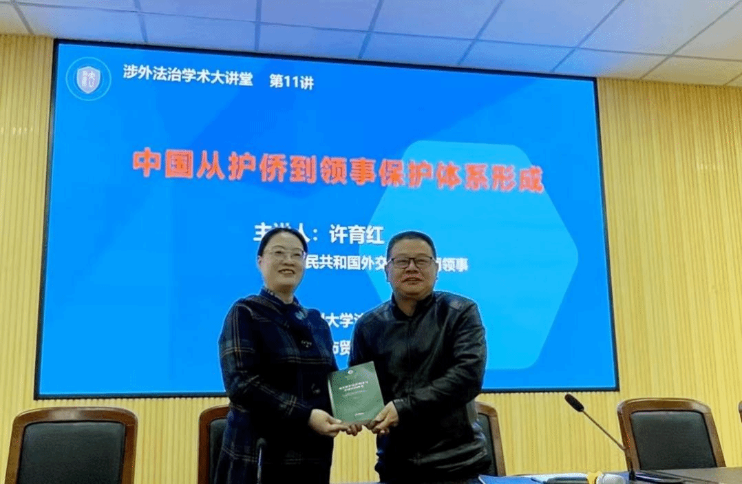 12月22日下午,外交部领事司领事许育红博士莅临看片狂人 ,在301会议室为师生作了题为《中国从护侨到领事保护体系形成》的讲座,包括国际经贸规则专业在内的看片狂人 100多位师生参加。看片狂人 周湖勇副院长主持讲座,热烈欢迎许领事的到来,并代表看片狂人 接受许领事的赠书。