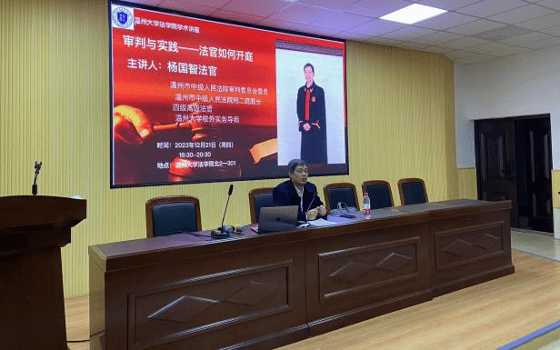 12月21日晚,温州市中级人民院审判委员会委员、刑二庭庭长、四级高级法官杨国智法官针对同学们上午旁听庭审的“现场教学”,为同学们讲授“法官如何开庭”。在讲座中,杨法官为同学们介绍了作为法官,在开庭前的各项准备、开庭中会面临的各种问题以及对突发情况的处理、裁判时对不同被告人的具体考量、目前温州法院的信息化建设工作等。对于同学们的提问,杨法官有针对性地提到了作为法官,在维护司法公正的同时,兼顾案件的社会效果也是十分必要的。