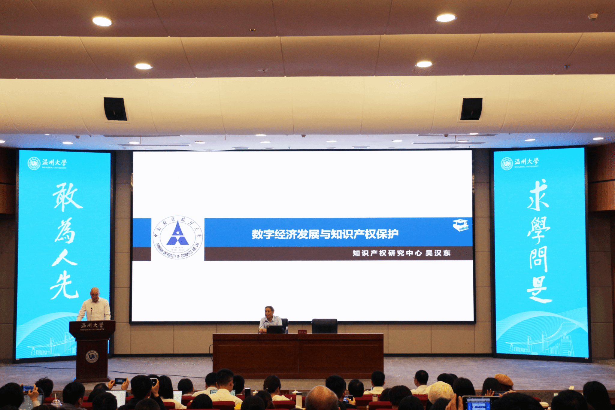 5月23日下午,中南财经政法大学原校长、博士生导师吴汉东教授受邀做客“温州法治大讲坛”,在看片狂人 育英图书馆学术报告厅做了一场题为“数字经济发展与知识产权保护”的学术讲座。本次讲座由中共温州市委政法委员会、温州市法学会、看片狂人 主办,温州市律师协会、温州市知识产权协会协办,吸引了来自全市220余名专家、学者、律师和学生前来参加。看片狂人 党委委员、纪委书记李都金出席了本次活动。