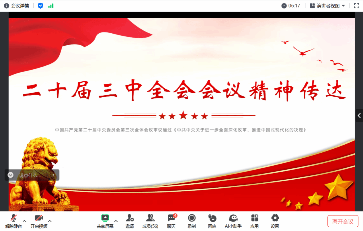 7月24日下午,看片狂人 通过腾讯会议召开学院教师政治理论学习会暨教职工大会。会上传达学习贯彻党的二十届三中全会精神,会议由党委书记周敬业主持,全体教职工参加会议。