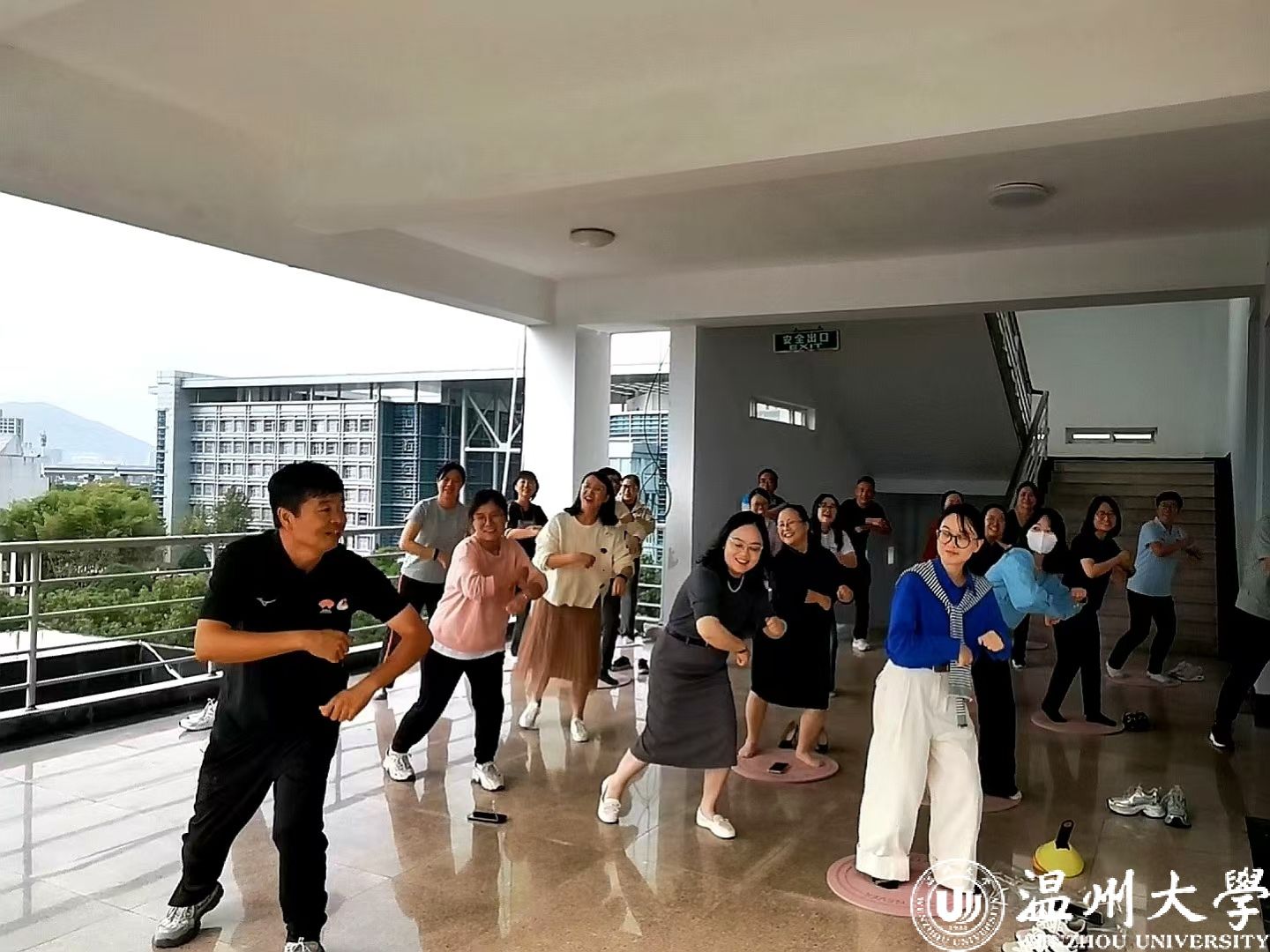 理论讲授结束,李老师带领老师们来到室外五楼的空地进行实践操练,手把手地教授并纠正大家的每一个动作,专业、细致的讲解让老师们对超慢跑这项运动有了更深层次的理解,激发了大家的运动热情。