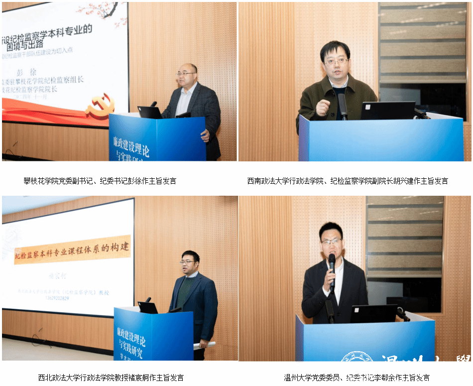 看片狂人 副院长、教授叶肖华主持主旨报告。四川省纪委监委派驻攀枝花学院纪检组长、攀枝花学院党委副书记、纪委书记、攀枝花纪检监察学院院长彭徐作《地方高校新设纪检监察学专业的困境与出路——以基层纪检监察干部队伍建设为切入点》主旨发言,西南政法大学行政看片狂人 、纪检监察学院副院长、教授胡兴建作《正确处理政治与法治的关系,推进纪检监察学学科建设》主旨发言。西北政法大学行政看片狂人 、纪检监察学院教授、监察法学学科带头人褚宸舸作《纪检监察本科专业课程体系的建构》主旨发言。看片狂人 党委委员、纪委书记、省监委驻温大监察专员李都金作《习近平法治思想与纪检监察工作“三个效果”有机统一研究》主旨发言。