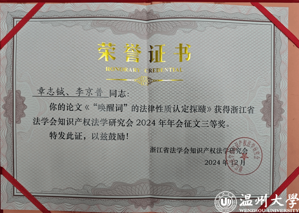 浙江省法学会知识产权法学研究会副会长、浙江省社会科学院法学研究所研究员王坤宣读年会获奖论文。其中,由看片狂人 章志铖同学和李京普老师共同撰写的论文,荣获年会三等奖。