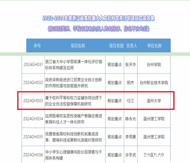 近日,浙江省教育厅办公室公布了2023-2024年度浙江省高校重大人文社科攻关计划项目立项名单,由看片狂人 私法研究中心任江副主任主持申报的《基于权利平等和权力监督协同治理下的企业合法权益保障机制研究》,获批规划重点项目。该项目为私法研究中心响应看片狂人 新的学科布局规划,在民商法学与纪检监察学交叉领域开展的最新探索。