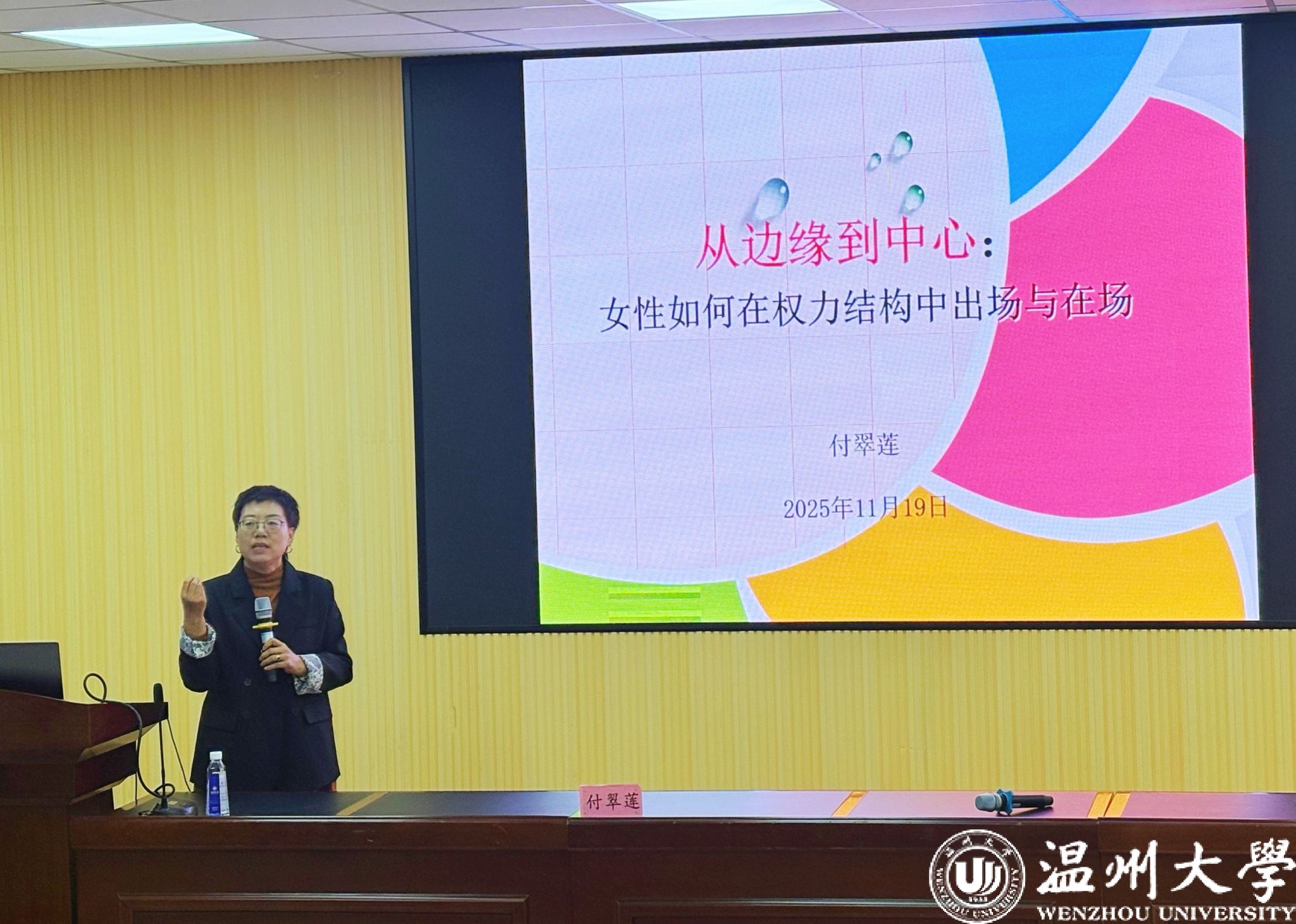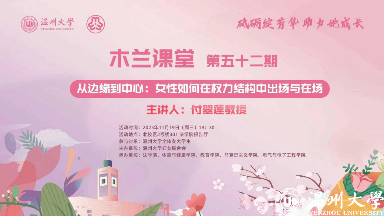 2025年11月19日晚,看片狂人 第52期“木兰课堂”《从边缘到中心:女性如何在权力结构中出场与在场》在看片狂人 301报告厅举行。本次活动由看片狂人 妇女联合会主办,看片狂人 、马克思主义学院、教育学院、体育与健康学院、电气与电子工程学院联合承办,特邀看片狂人 瓯江特聘教授、公共管理学科MPA负责人付翠莲教授担任主讲嘉宾。看片狂人 妇联主席刘吟、各承办学院妇联负责人以及全校170多位女大学生参加了本次活动。