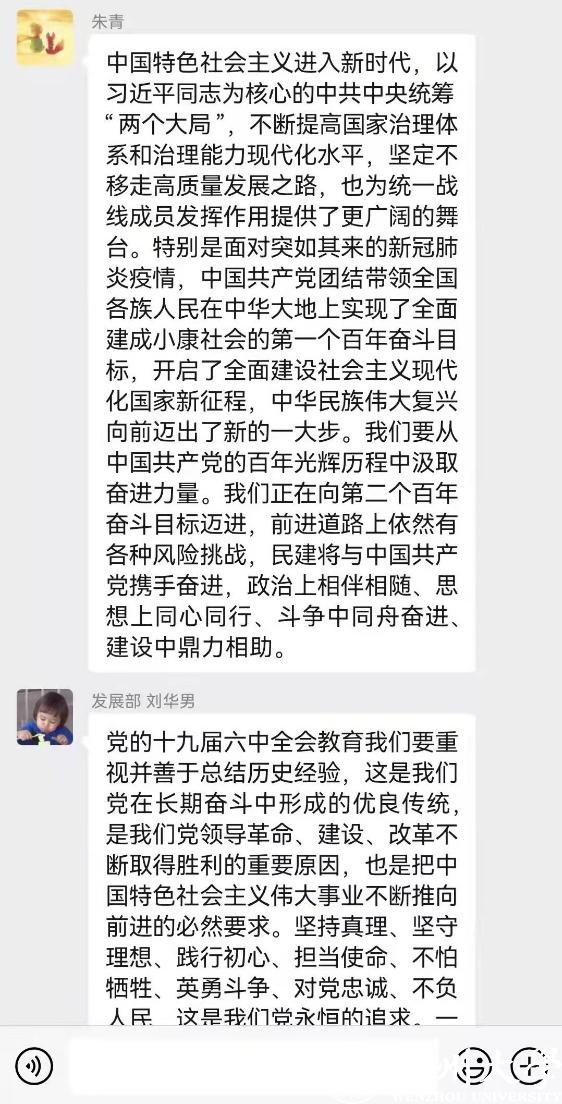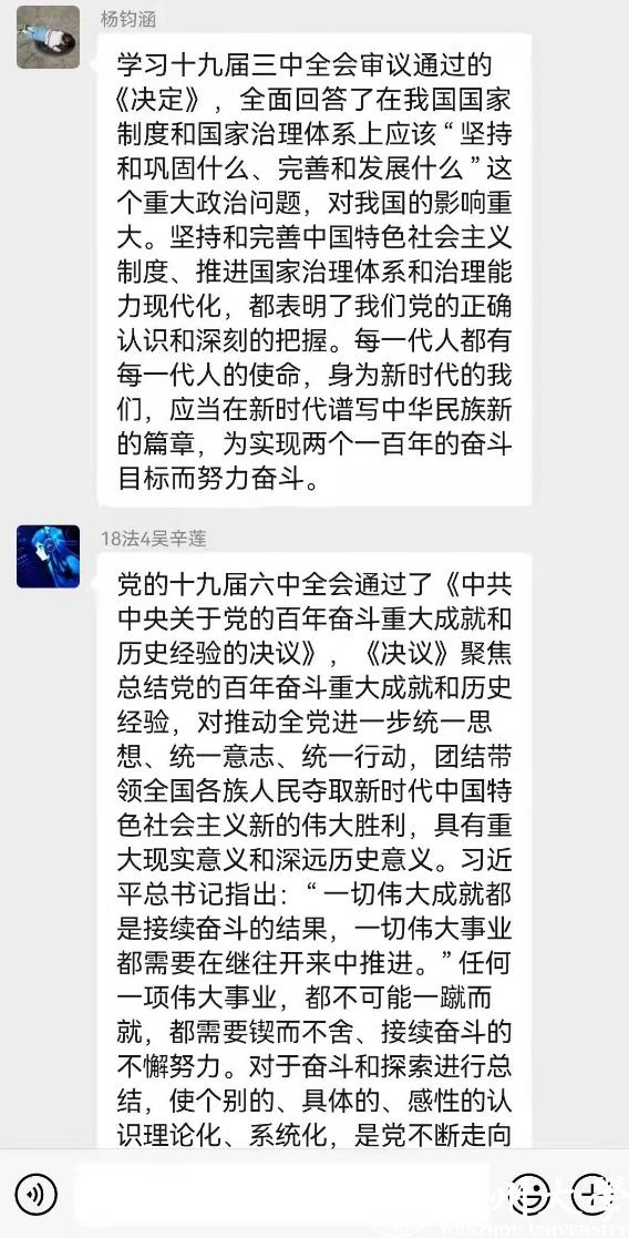 知所从来,方明所去。通过学习党的十九届六中全会公报和《中共中央关于党的百年奋斗重大成就和历史经验的决议》,支部各位党员同志们踊跃发言,大家纷纷表示,要将党的十九届六中全会所总结的百年奋斗经验学懂、弄通、做实,以专业服务社会、青春献给祖国的实际行动,在学思践悟中争做习近平新时代中国特色社会主义思想的坚定信仰者、忠实实践者、积极传播者。