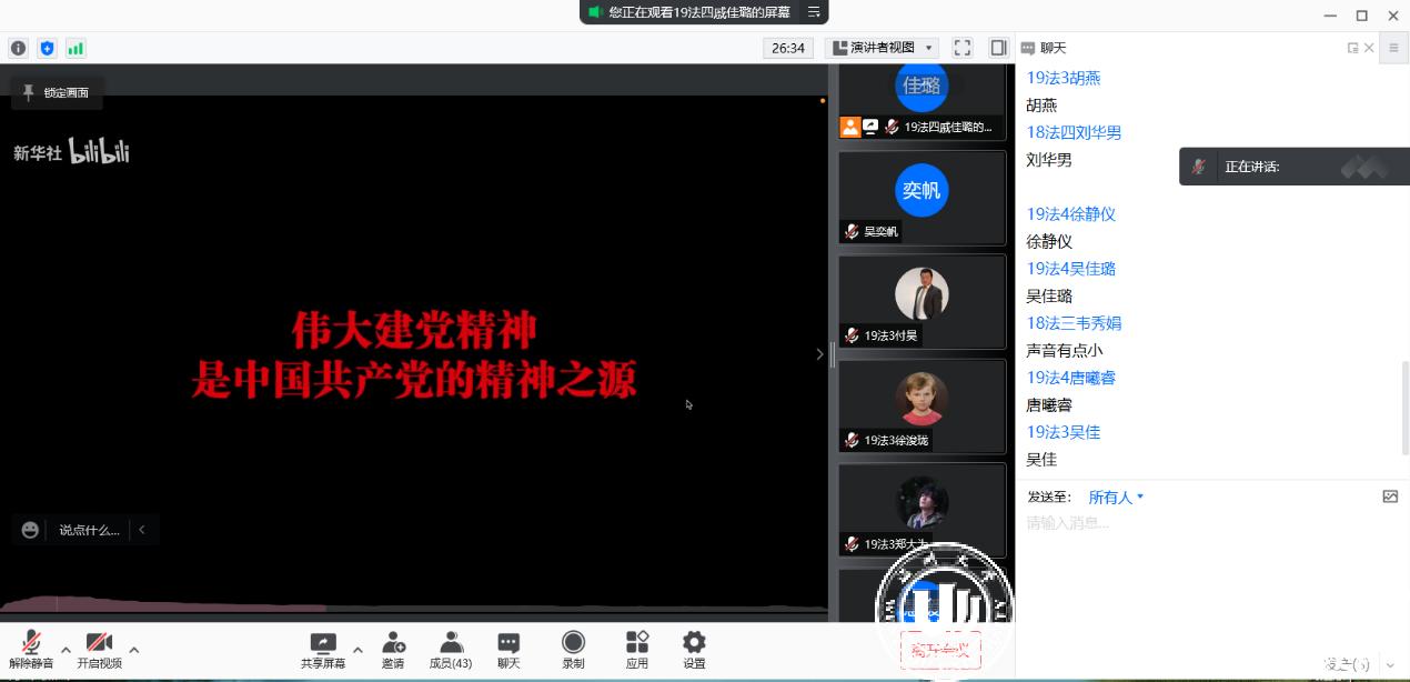 大会的第二项议程是学习十九届六中全会精神的相关主题学习活动。党支部助理戚佳璐为大家放映了“试看将来的环球,必是赤旗的世界”微电影,同学们从电影中所展现的优秀人物中汲取到了思想之光、精神之钙、奋进之力,进一步深刻学习领悟了党的十九届六中全会精神。也更加深入全面地体认到党的百年奋斗所取得的重大成就和历史经验,明确了新的百年征程中法学学生党员的责任担当。