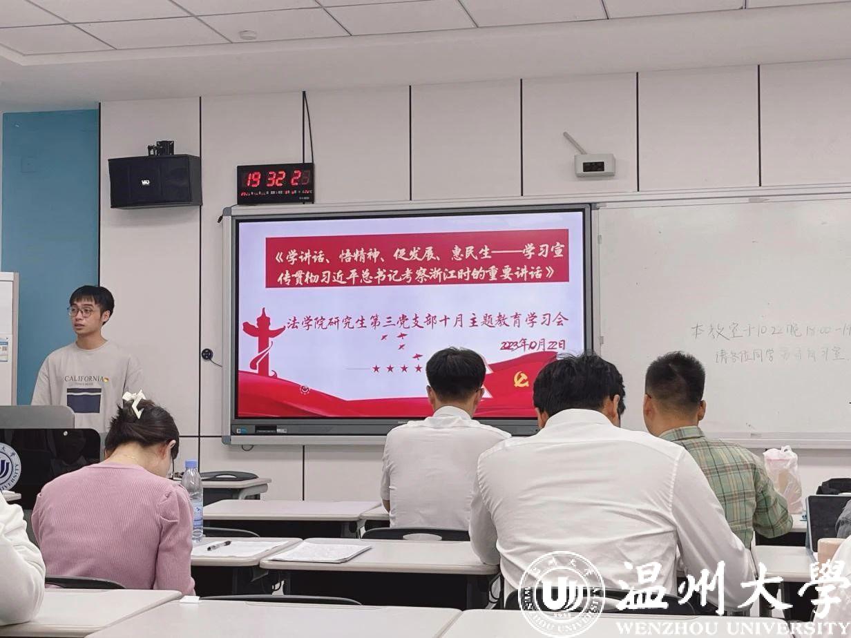 2023年10月22日晚,看片狂人 研究生第三党支部开展了“学讲话、悟精神、促发展、惠民生”主题党日活动,重点学习宣传贯彻习近平总书记考察浙江时的重要讲话。付玉霞、蒋元旦、项娉娉、周心钰、袁一函、葛康怡、张怡轩、王冠梅杰、莫友同志分别就“杭州亚运会开幕前夕,习近平赴浙江考察”“习近平总书记为浙江省改革发展作出的系列重要指示”“学好用好《习近平经济思想学习纲要》”三个主题进行了学习心得分享。