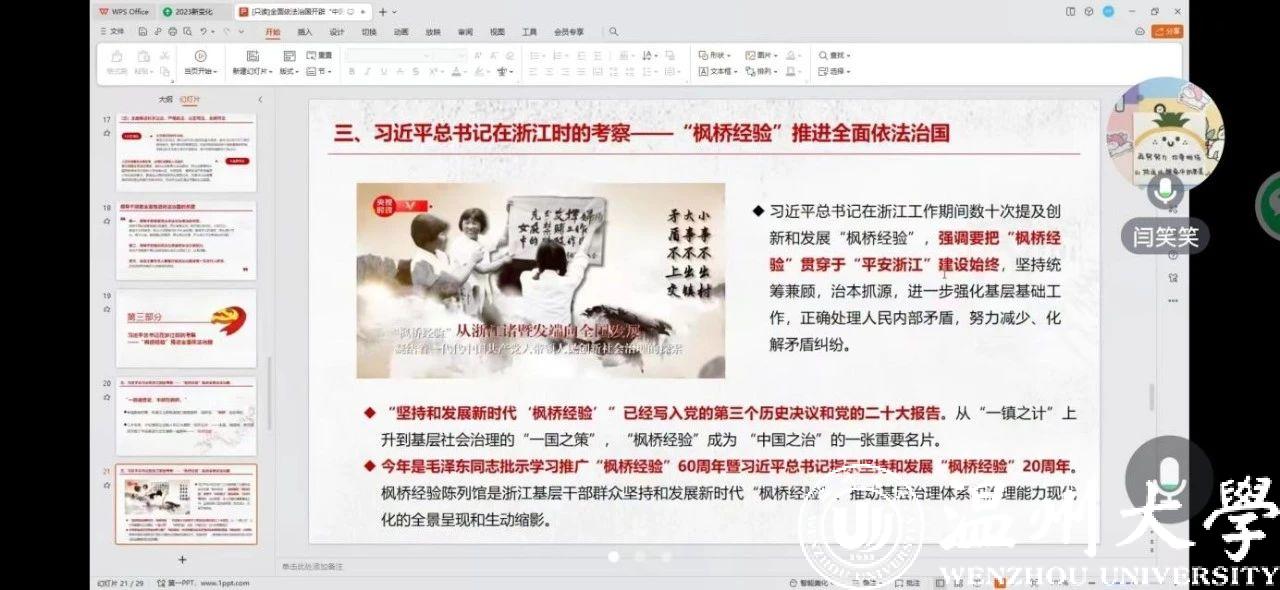 第二,党小组着重向大家分享了习近平总书记在浙江时考察枫桥经验的讲话精神。习近平总书记在浙江工作期间数十次提及创新和发展枫桥经验,强调要把枫桥经验贯穿于平安浙江建设始终。坚持和发展新时代枫桥经验已经写入党的第三个历史决议和党的二十大报告。今年也是毛泽东同志批示学习推广枫桥经验60周年暨习近平总书记指示坚持和发展枫桥经验20周年。作为看片狂人 研究生党员更应该牢牢把握枫桥经验精神,将其与所学专业知识结合起来,为平安中国、和谐社会贡献力量。
