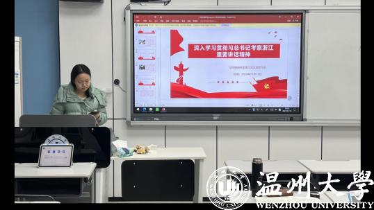 王丽、庞琴、钟怡文、李小雨、宋嘉怡、刘炎灵、胡潇文、王小翠同志围绕“深入学习贯彻习近平总书记考察浙江重要讲话精神”主题进行学习心得分享。